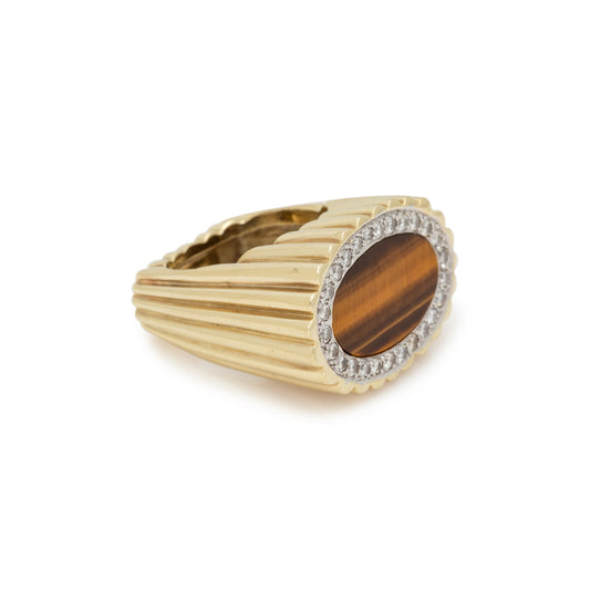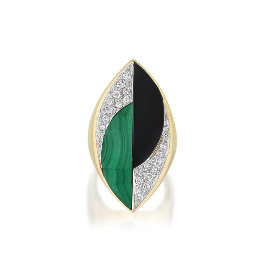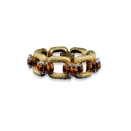 Founded in 1960 ‘La Triomphe’ was the name given to a range of jewellery created by the American firm Astoria Jewelry Manufacturing Company of Long Island, New York. The first recorded use of the name (which was trademarked), accompanied by its distinctive logo of Paris’s Arc de Triomphe, was in June 1965. For the next twenty or so years they created some fabulously bold pieces of cocktail jewellery including rings, bracelets and earrings. Almost exclusively made in yellow gold, the pieces were set with brightly coloured gems such as peridot, amethyst and tourmaline as well as hardstones such as turquoise, lapis lazuli and malachite. The name is no longer in use but the jewellery remains widely collected and appreciated for its vibrant colours, strong designs and vintage aesthetic.
