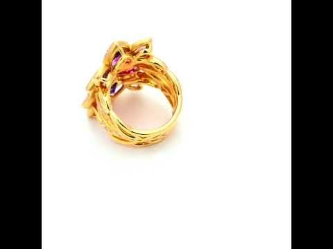 18 Kt yellow gold ring set with diamonds, amethysts and tourmaline.