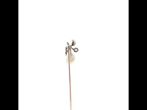 9 Kt pink gold and silver stick pin embellished with old cut diamonds and baroque pearl.