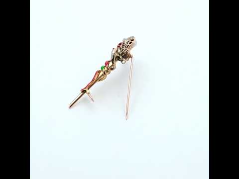 9 Kt yellow gold and silver Caduceus shaped brooch set with diamonds, red stone and a pearl.