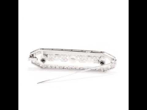 Platinum bar brooch set with diamonds and backed by a transparent crystal plaque.