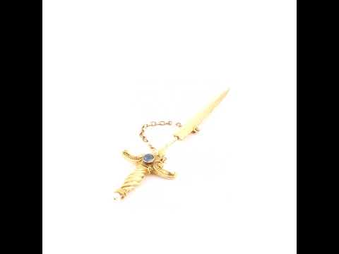 18 Kt yellow gold pin in the shape of a sword set with a pearl and a cushion shaped sapphire.