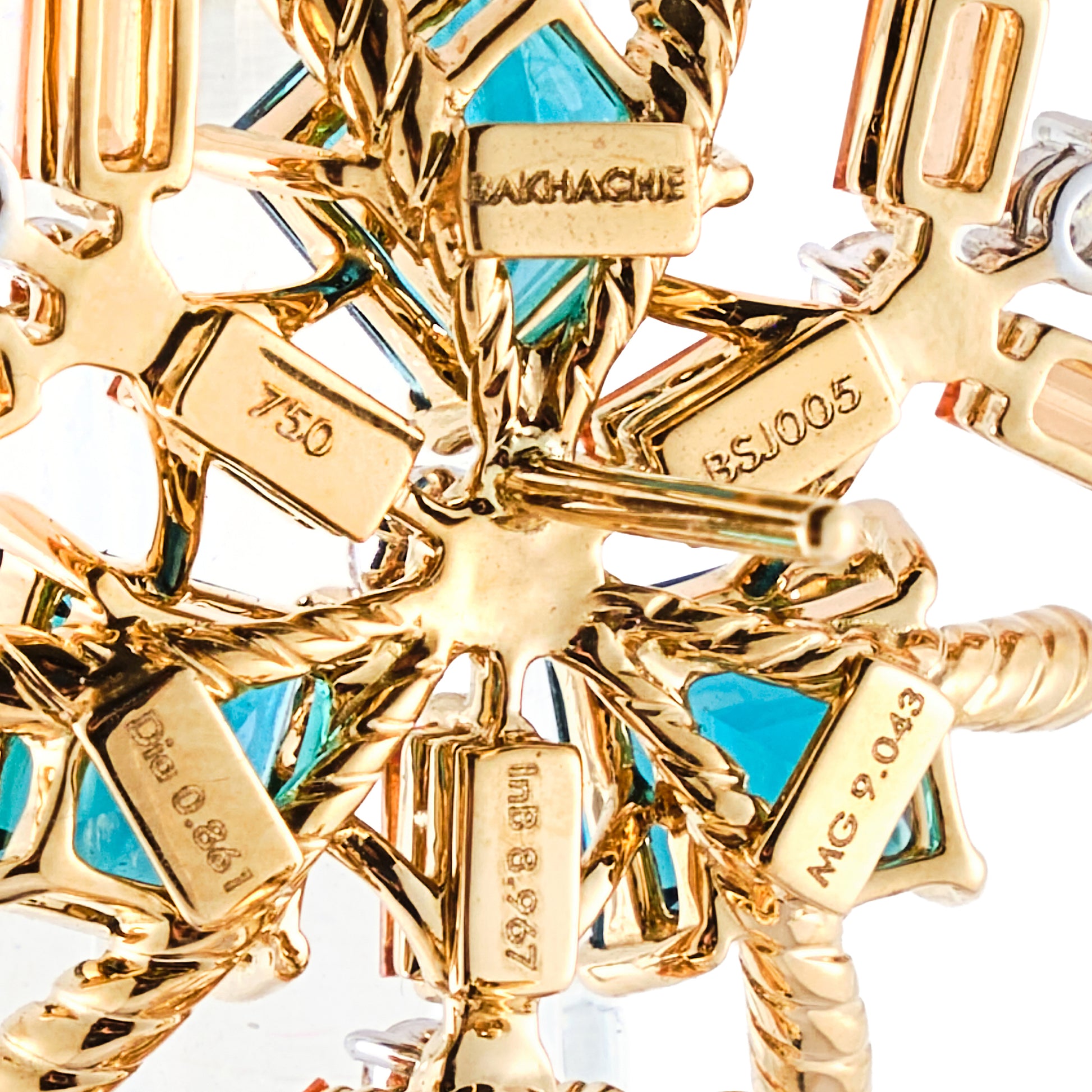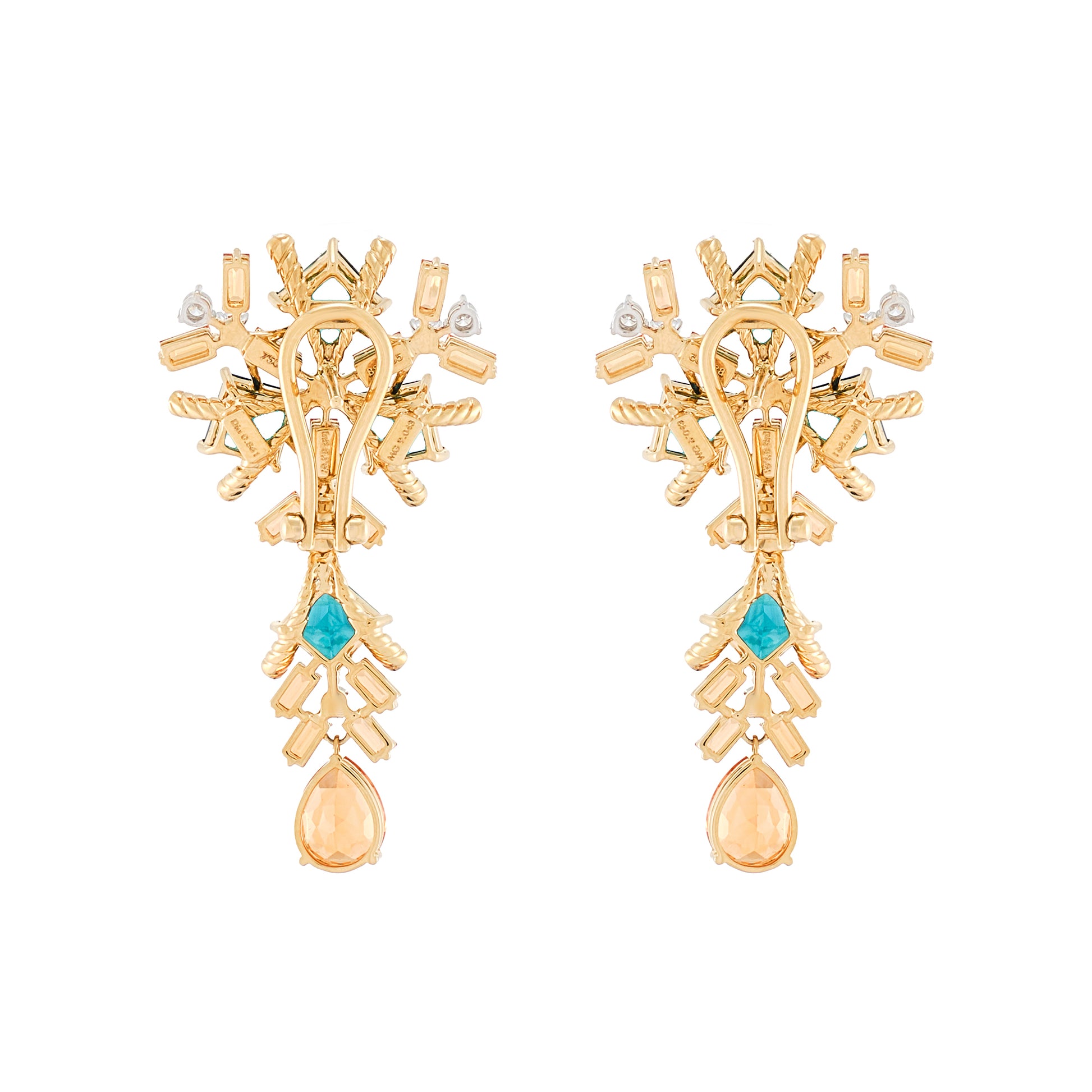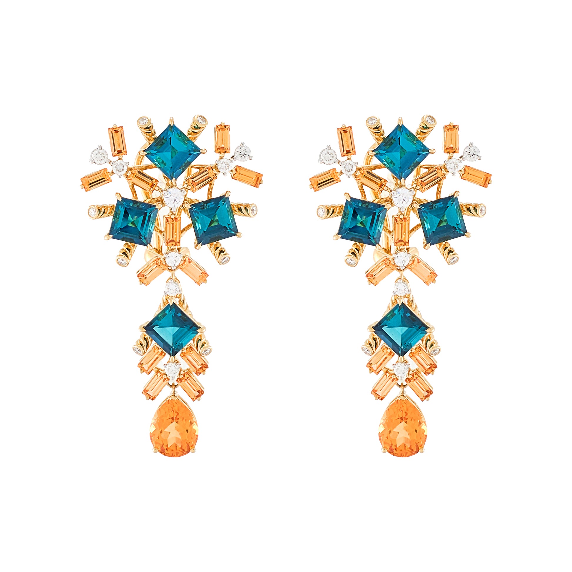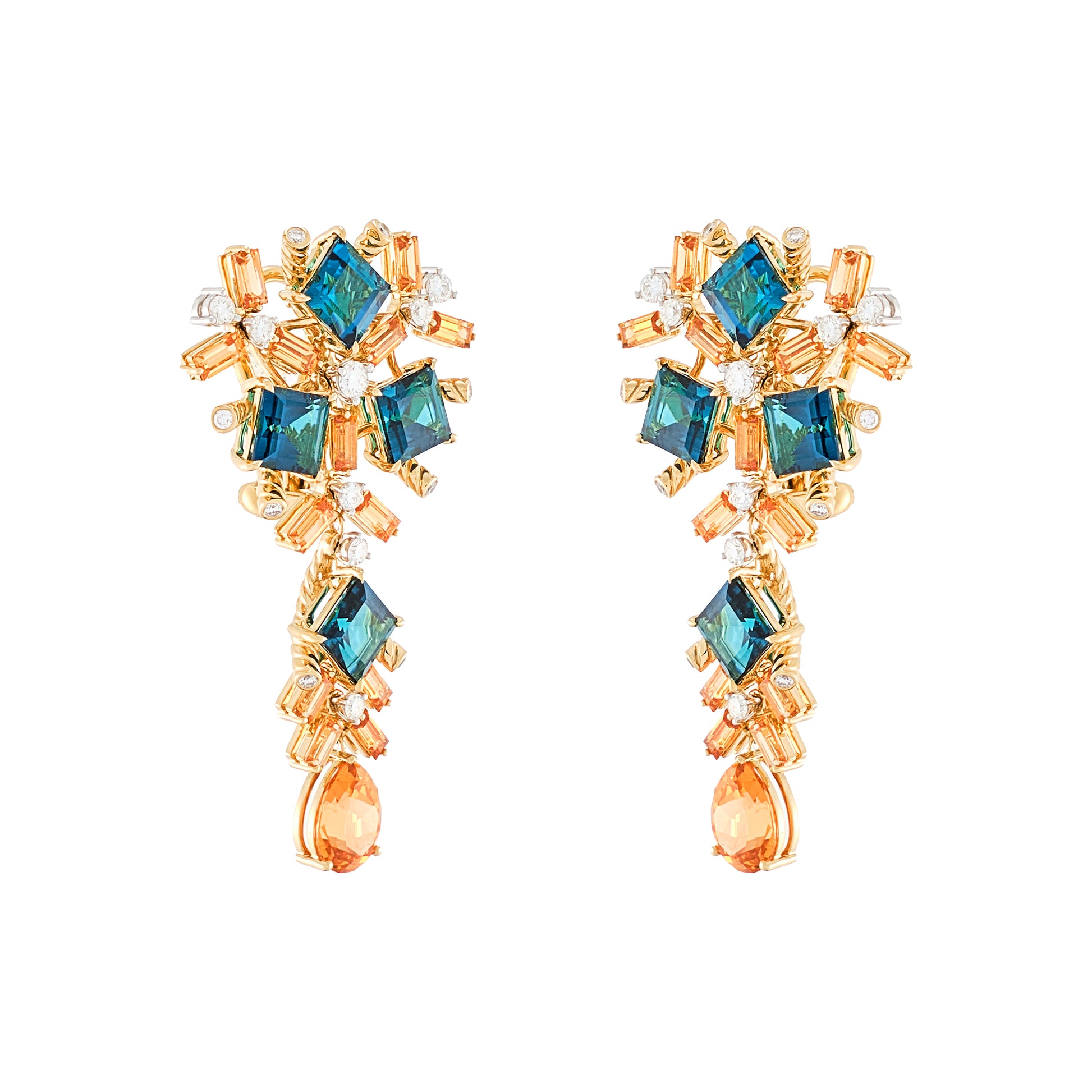 18 Kt yellow and white gold earrings set with Mandarin Garnet Spessartite, Blue Indicolite and Diamonds