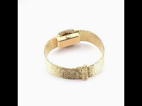 14 Kt yellow gold mystery wartch set with diamonds. Hand wound mechanical movement.
