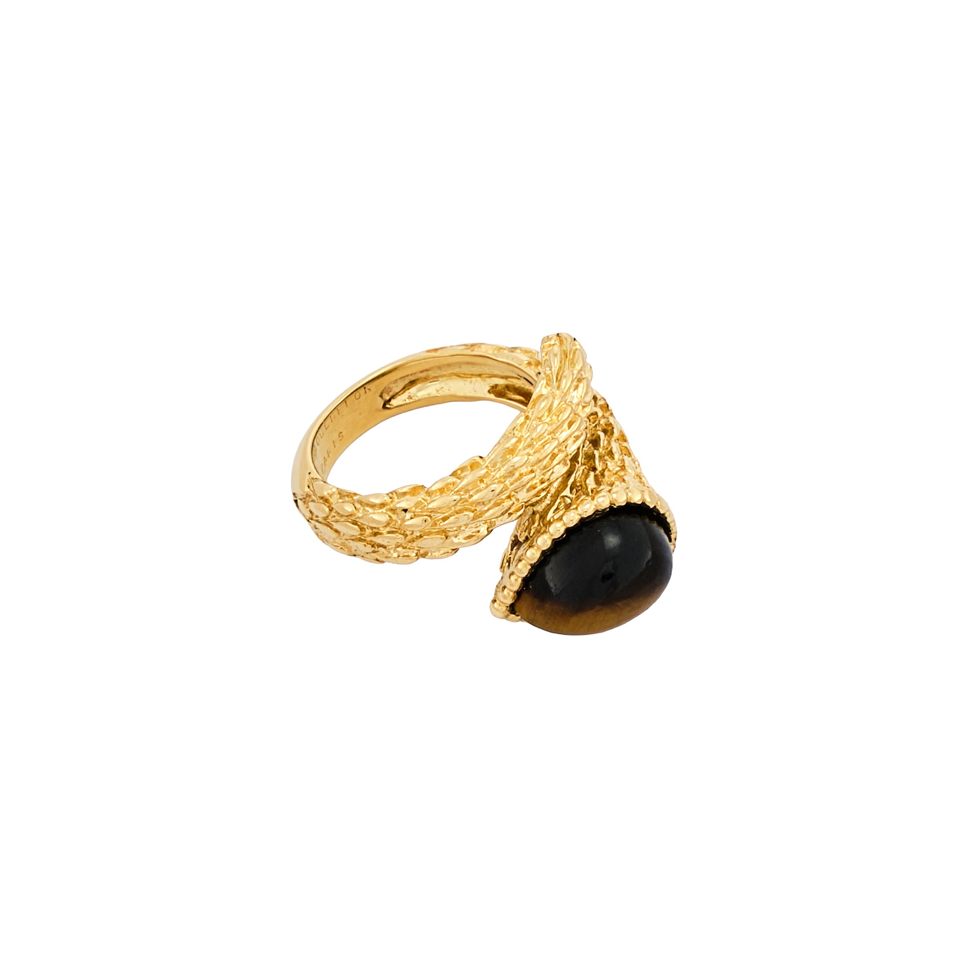 18 Kt yellow gold ring set with a cabochon Tiger's Eye. Hallmark: eagle head Master stamp: André Vassort workshop.
