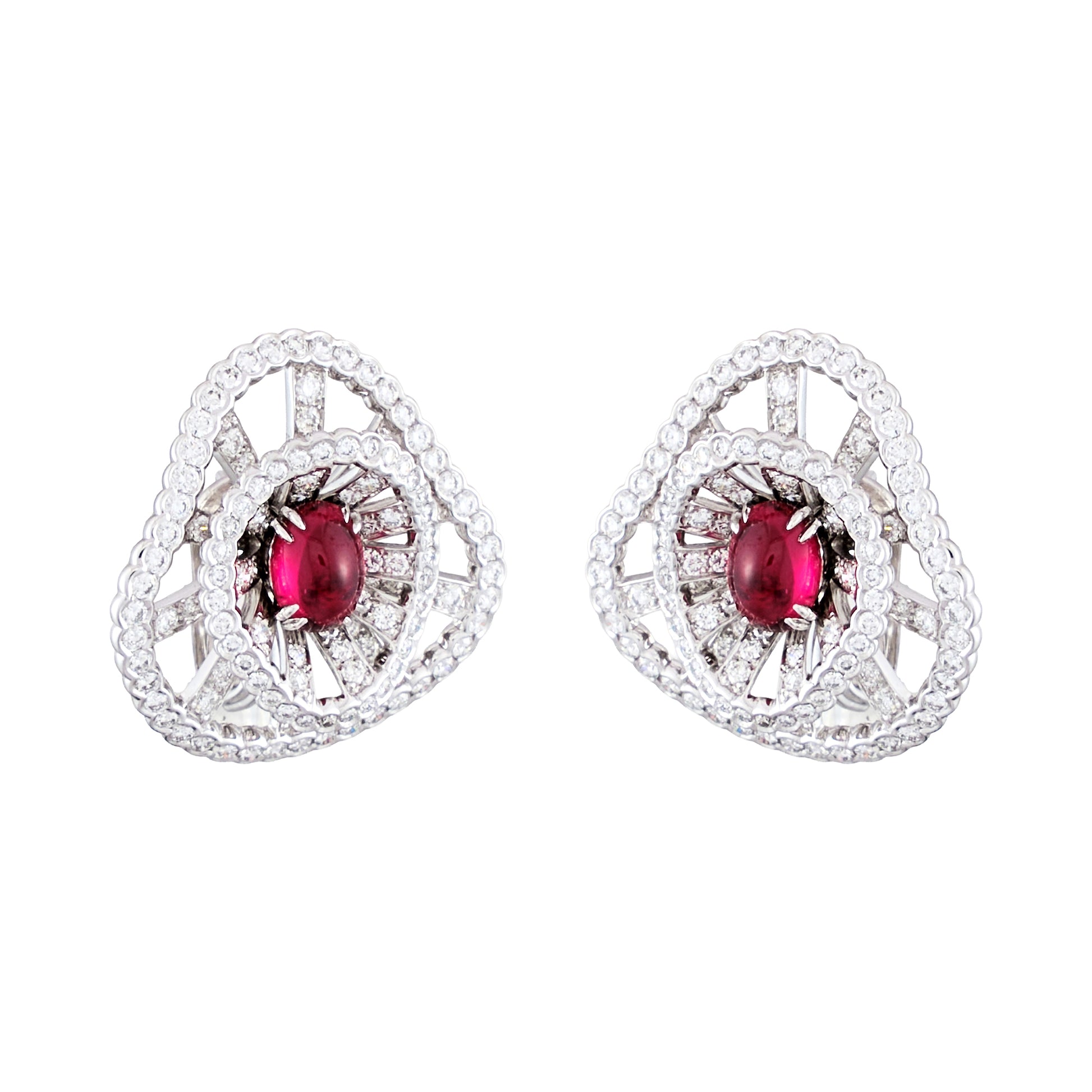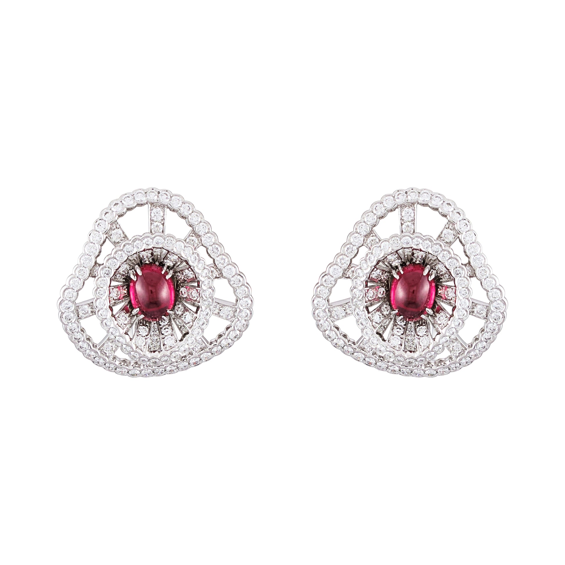 18 Kt white gold earrings set with oval cabochon spinels and round brilliant cut diamonds.