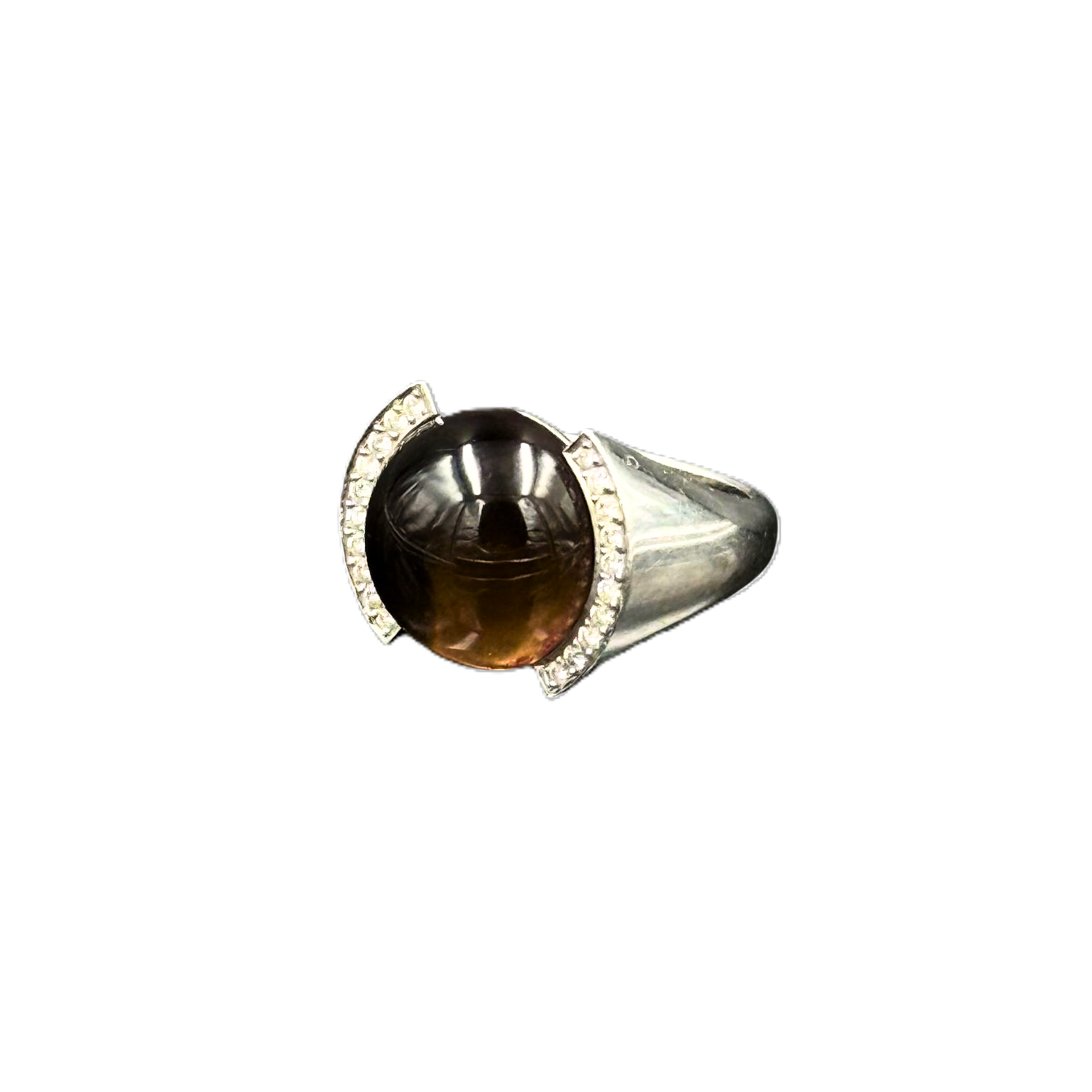 18Kt white gold set with a cabochon of smoky quartz and two lines of round diamonds. Manufacturer's hallmark of the Galbert company (1980) Swiss hallmark (Saint-Bernard).