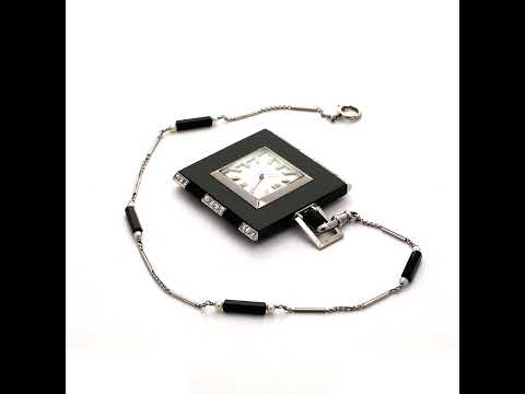 IWC Pocket watch in 14 Kt white gold trim and Black Onyx case. Partially set with diamonds. With gold and onyx chain. Mechanical winding movement.