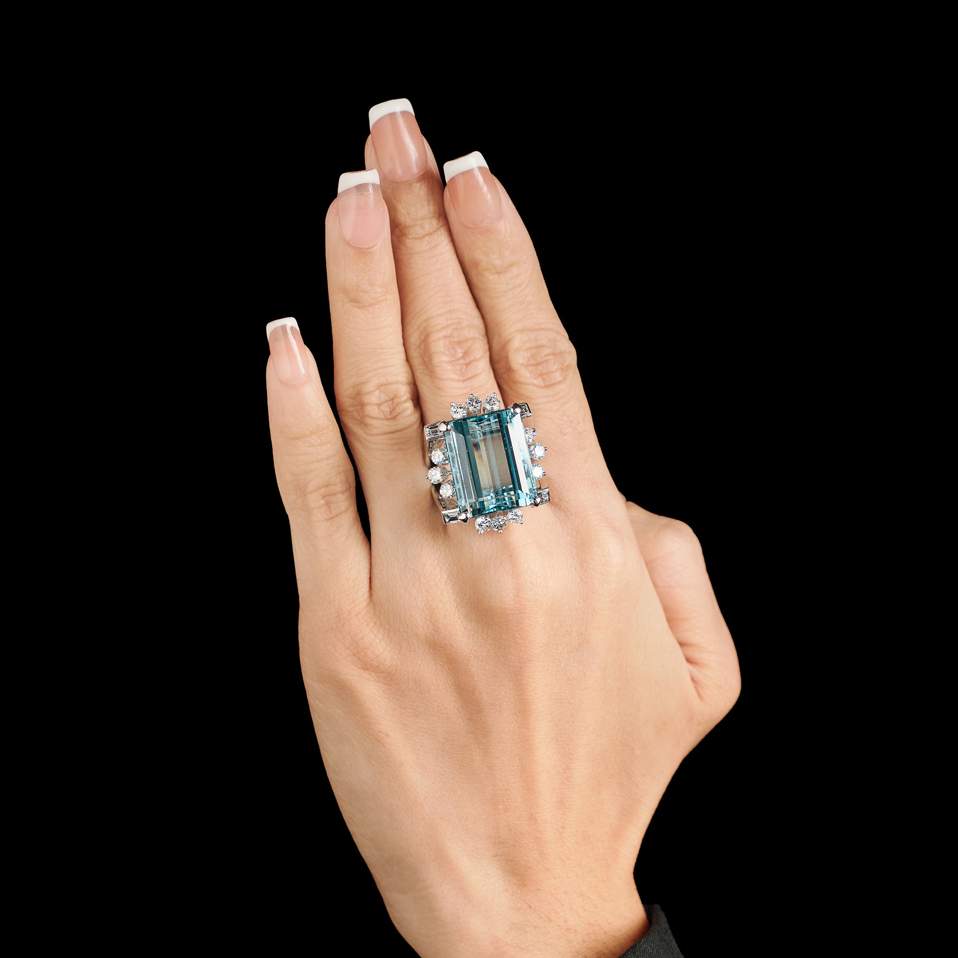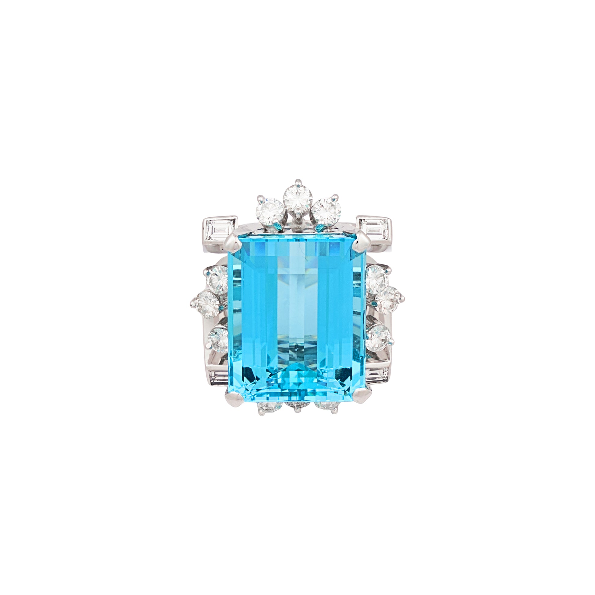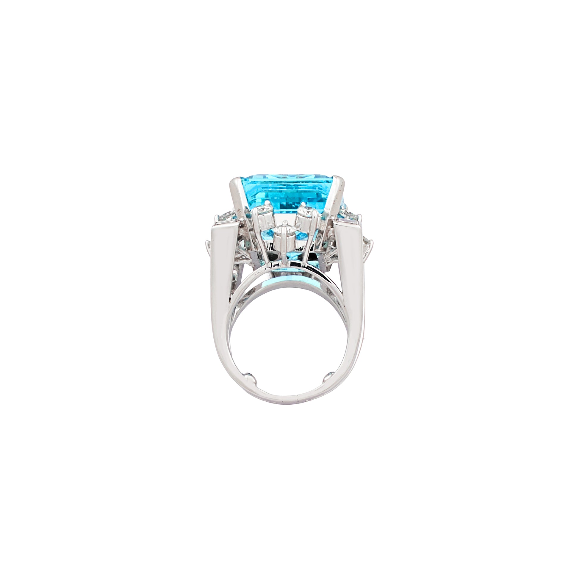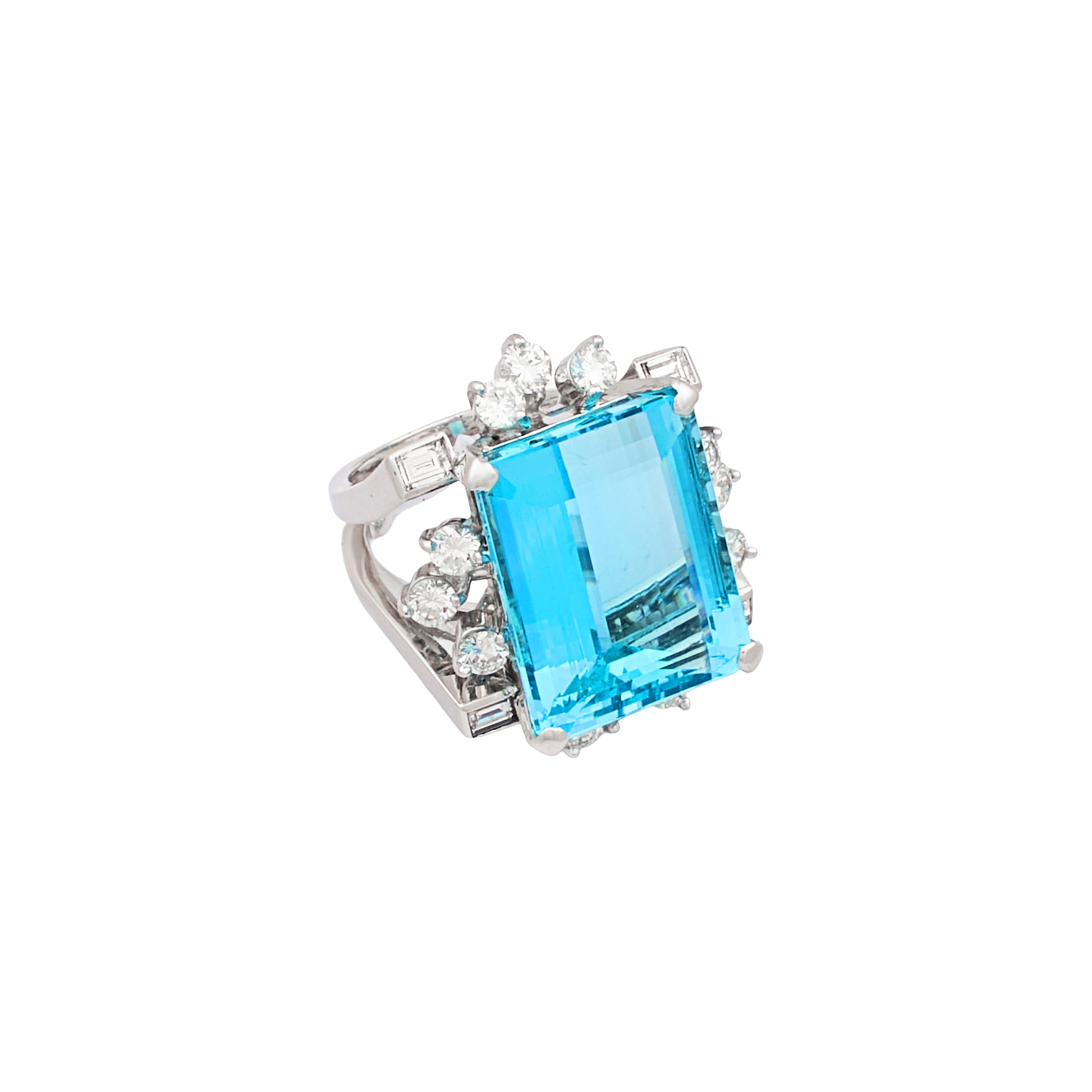 18 Kt white gold ring set with an octagonal step cut aquamarine accented by a border of round brilliant and baguette cut diamonds.