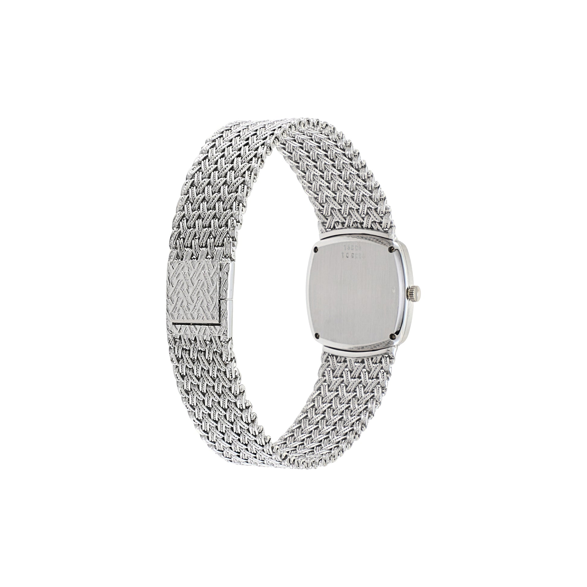 18 Kt white gold cushion-shaped ladies watch set with diamonds. Mechanical hand wound movement