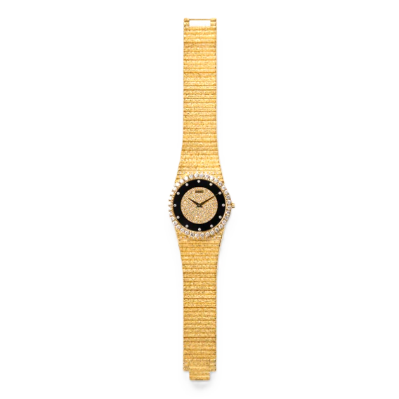 18 Kt yellow gold watch set with diamonds and black onyx dial. Movement: Automatic