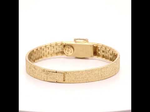 18 Kt yellow gold Ladies' wristwatch. Case: rectangular, bezel set with 16 diamonds. Winding crown on the back, Dial: silvered, Roman numerals and "baton" indexes. Movement: mechanical cal. 2P. Bracelet: in textured "ecorcé" gold, signature on the clasp.