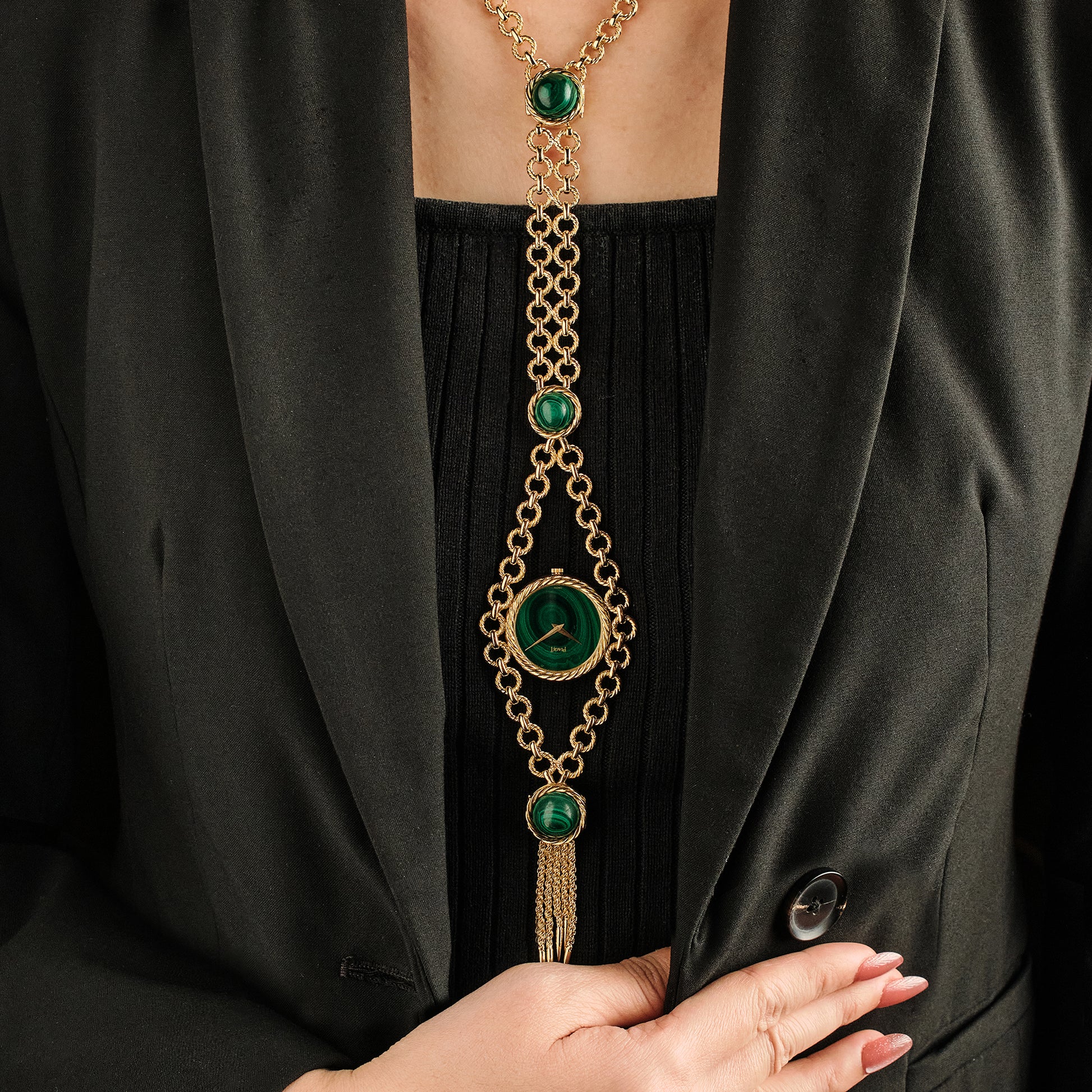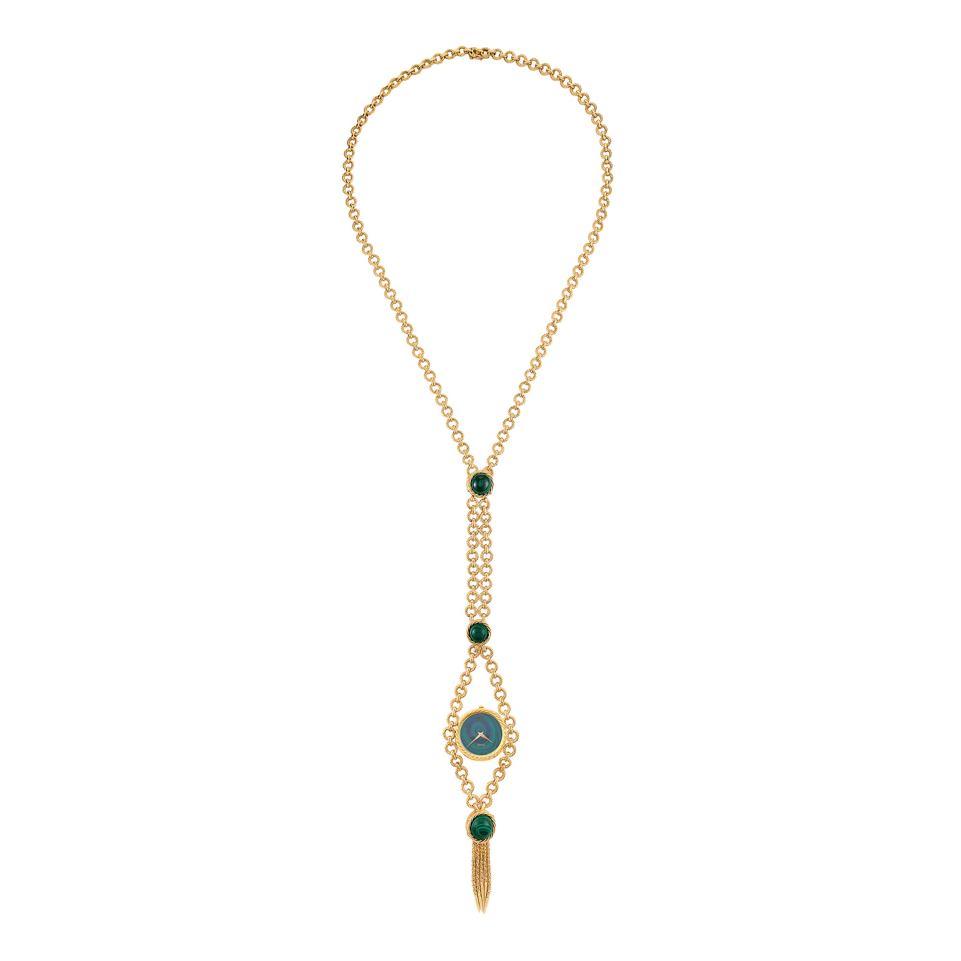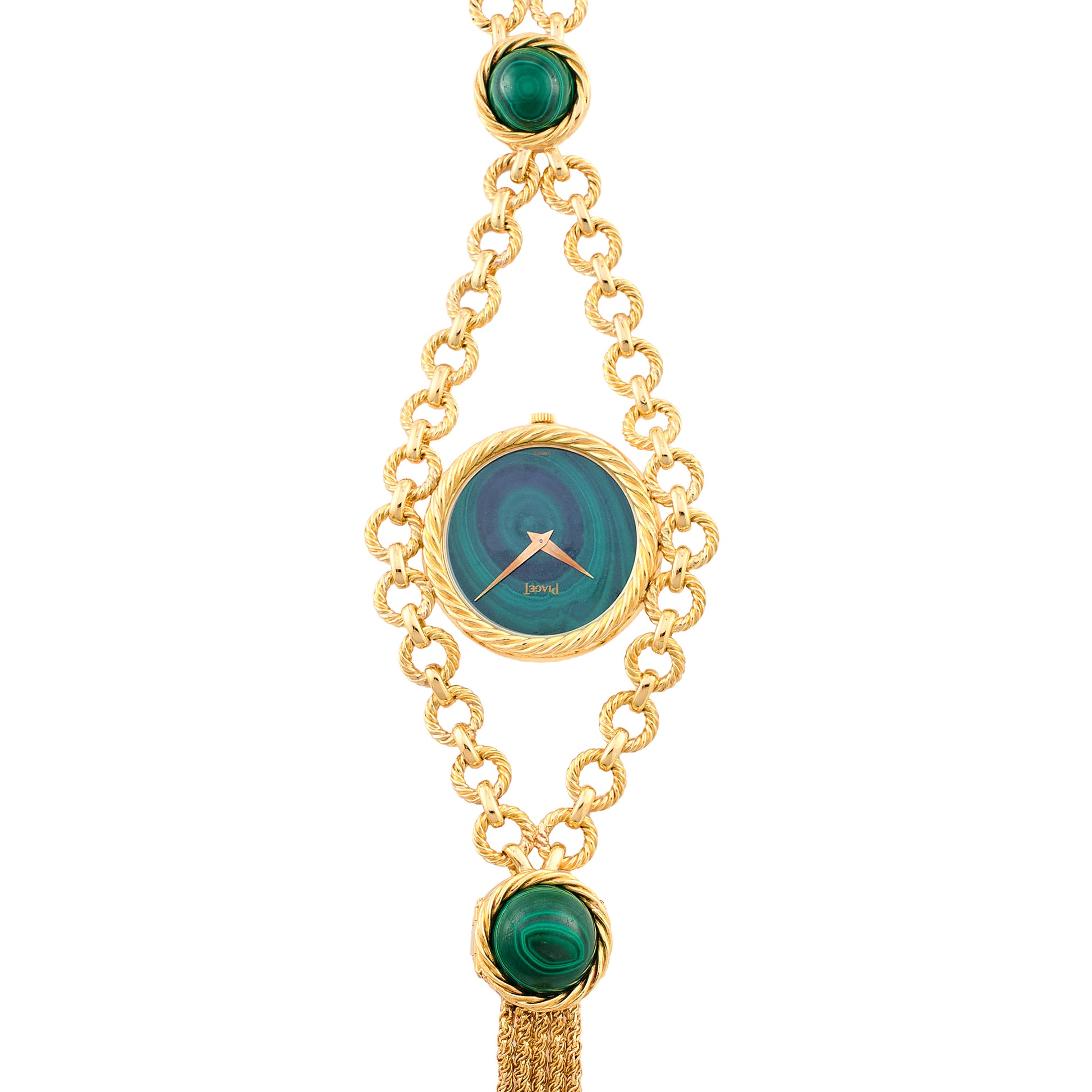 18 Kt yellow gold watch necklace set with Malachite. Piaget caliber 9P, 18 jewels manual wind movement.