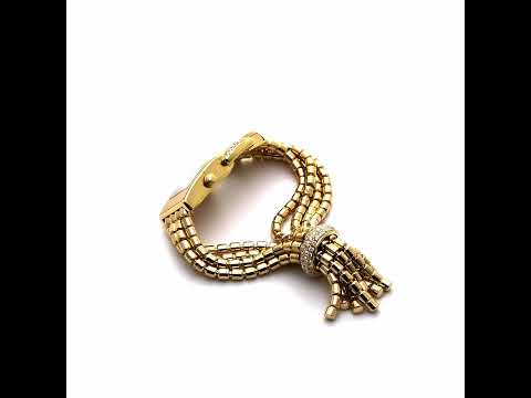18 Kt yellow gold Ladies' wristwatch set with diamonds. Rectangular case with large opening clasp and two articulated links set with small brilliant-cut diamonds. Quartz movement. Detachable bracelet in yellow gold, formed of four articulated chains linked by a diamond-set ring.