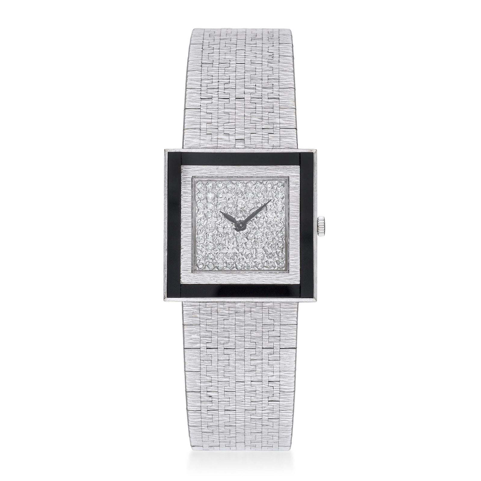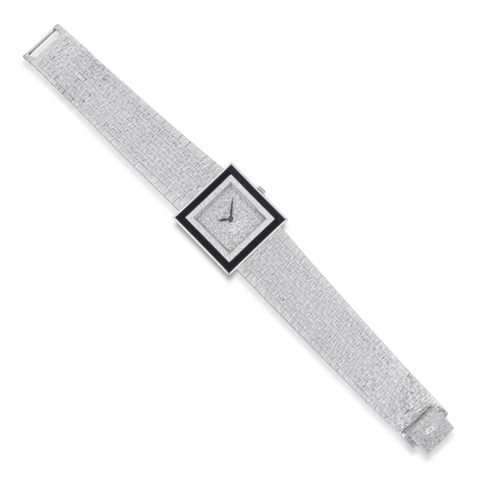 18K White gold watch with inlaid onyx bezel. DIAL: Original 18K white gold dial with full diamond pave. BRACELET MATERIAL: Original integrated bark finished bracelet in 18K white gold. MOVEMENT: Manual