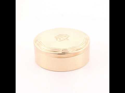 14 Kt Gold Pill Box with Sterling Silver Case of circular form decorated with shaped and stepped cover with incised crown to centre. Crown was not part of the original design for the box. Possibly added to commemorate Queen Elizabeth II's coronation.