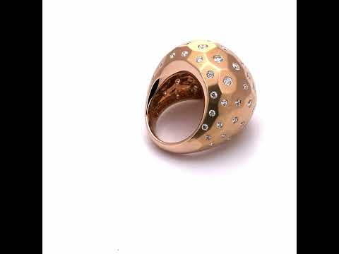 18 Kt rose gold ring set with diamonds. The bombe design of soft matte finish with geometric shaping mounted with flush-set brilliant-cut diamonds on each facet.