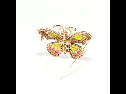 12 Kt yellow gold and silver butterfly brooch set with diamonds and colored stones and finished with enamel work