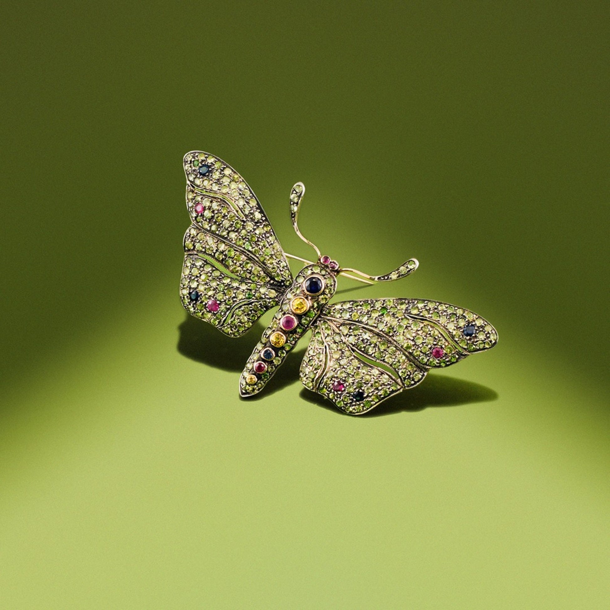 14 Kt yellow gold and silver brooch set with round rubies, sapphires, yellow sapphires, and round tsavorites.