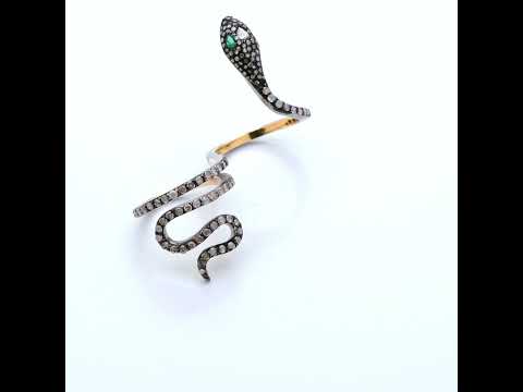 18 Kt gold double finger ring designed as a coiled snake set with rose and round cut diamonds, the eyes set with marquise cut emeralds.