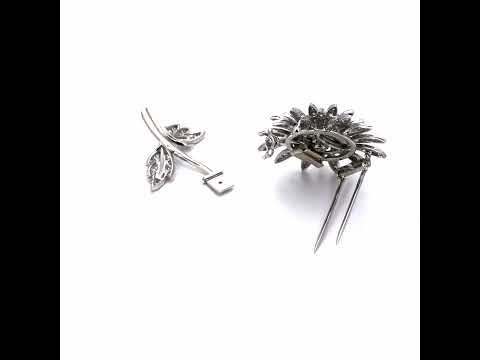 18 Kt white gold flower brooch set with round brilliant-cut and 8/8-cut diamonds. Can be transformed to wear only the flower without the stem. French work.