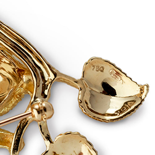 18 K yellow gold brooch in the form of a Koala Bear on branch with small inset ruby eyes and black enameled nose