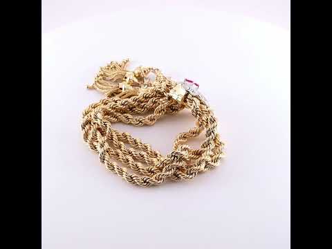 14 Kt yellow gold four strand ropetwist bracelet with a platinum closure centering a fancy-cut synthetic ruby, and set with full and old European-cut diamonds, suspending tassel fringe set with diamonds
